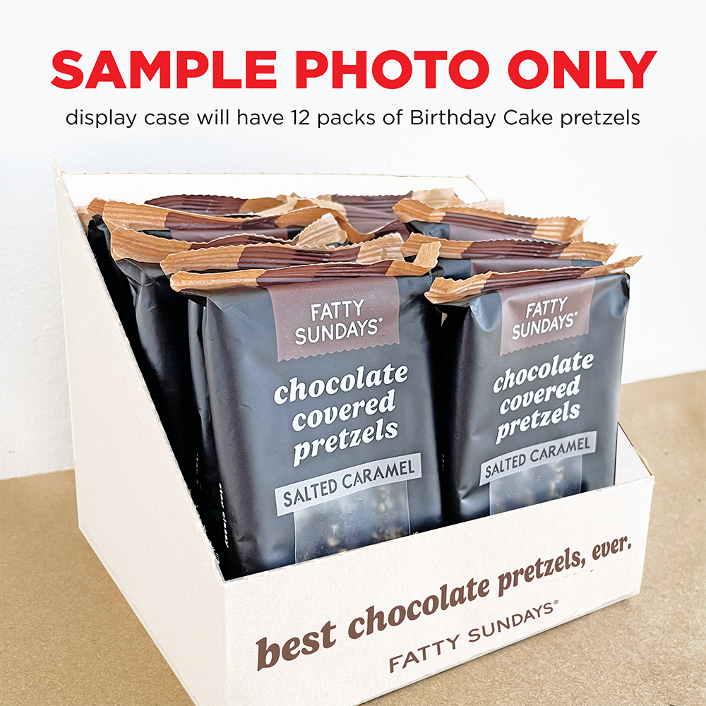 3 pretzel rods per pack, 12 packs per display case.