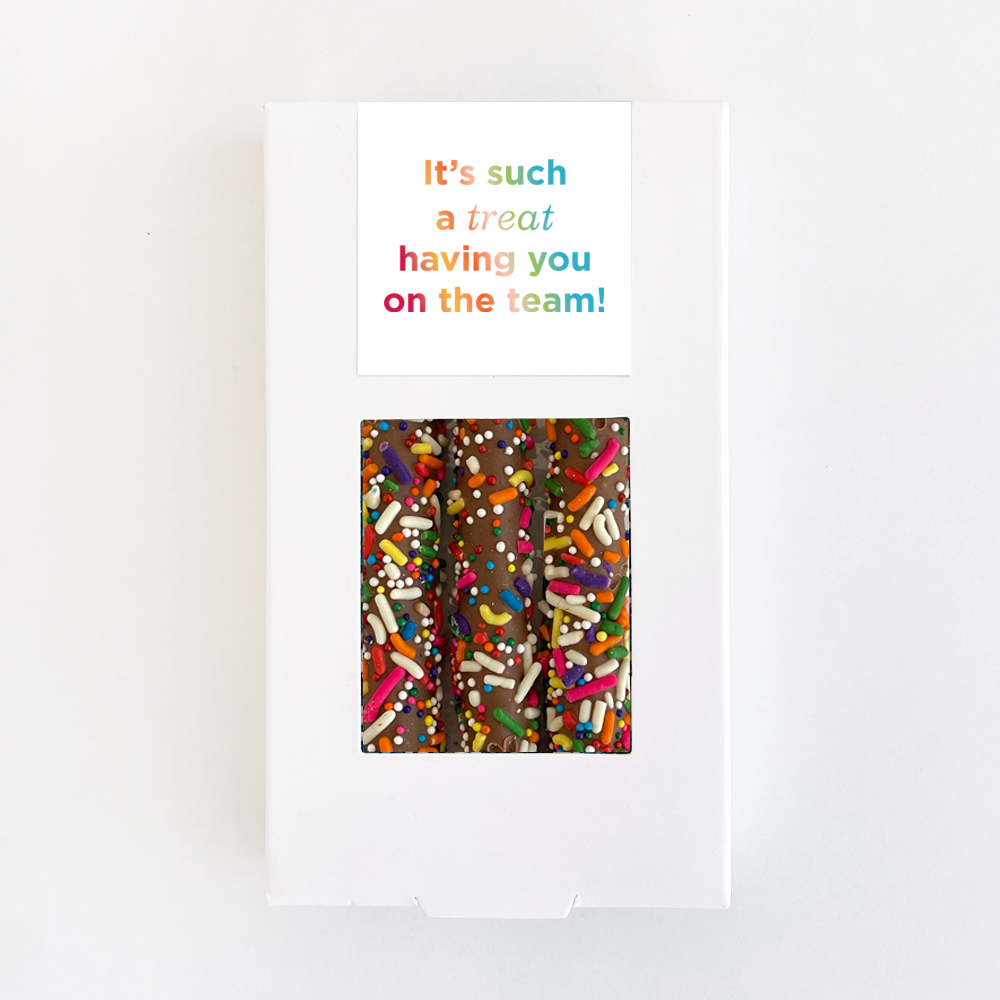 What sweeter way to show your appreciation any time of year than with these sweet, thoughtful ready-to-gift treats? This custom 3-piece pretzel box is packed with our famous Rainbow Sprinkles pretzels and branded with a colorful thank you label. This gift will be remembered long after the pretzels are gone!