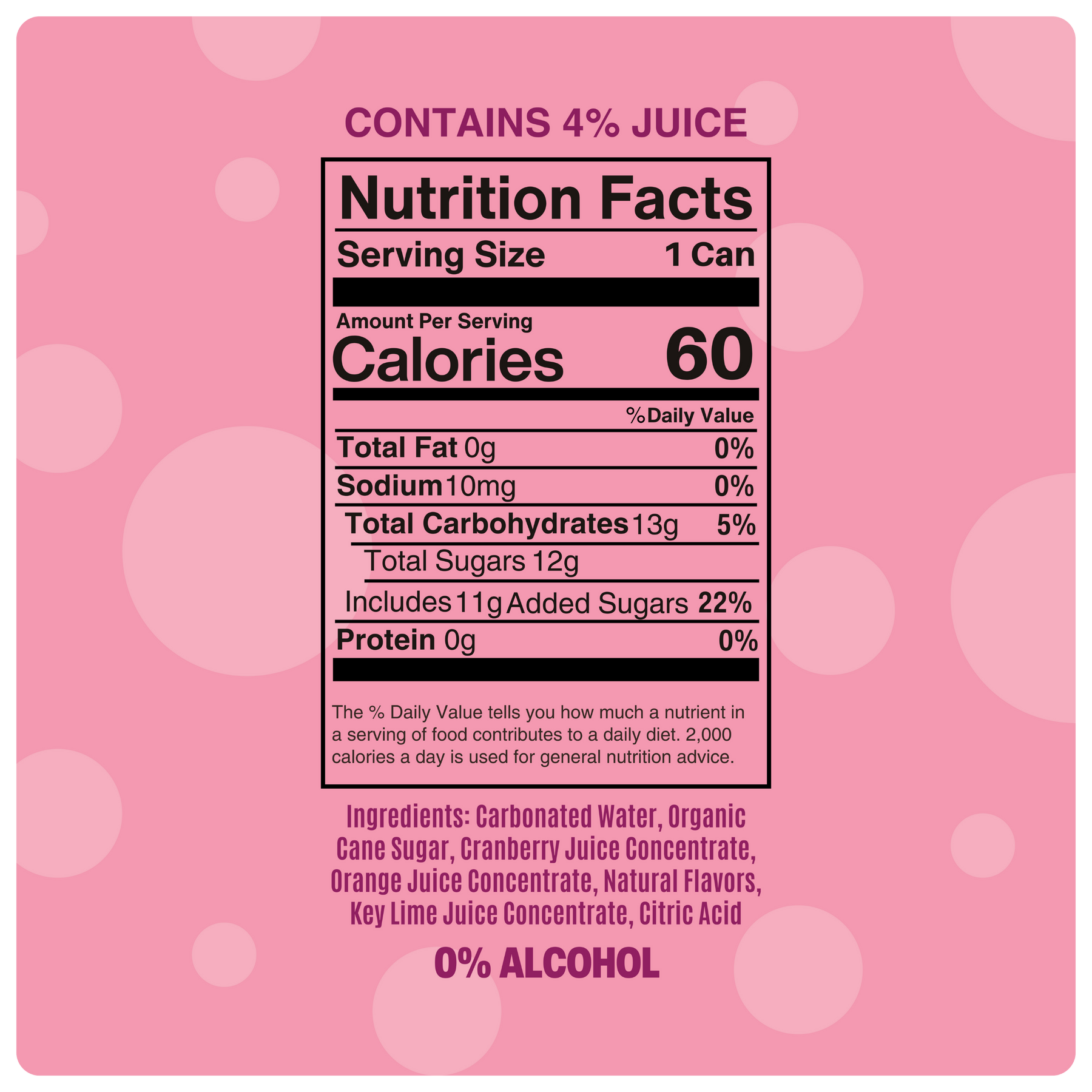 Crisp cranberry, zesty lime and a splash of natural orange juice, our sparkling Cosmo is upscale yet approachable in this elegant 750ML bottle (also available in 12 oz cans). Great for retail, hospitality, gifting, corporate gatherings & special events so everyone enjoys the fun. - CLEAN CRAFTED: with fruit juices & botanicals - LOW CALORIE: 20 cal per serving - MIXABLE: enjoy as mocktail or mix for light cocktail - HEALTHY: Vegan, Gluten Free, Kosher, Dairy-Free, Non-GMO, Alcohol-free - NOTES: crisp bright, citrus Serving Suggestion: Pour chilled Cosmo in champagne flute, garnish with fresh raspberries, enjoy! If you'd like a cocktail, add 1 oz vodka. INGREDIENTS: Carbonated Water, Organic Cane Sugar, Cranberry Juice Concentrate, Orange Juice Concentrate, Natural Flavors Lime Juice Concentrate, and Citric Acid.