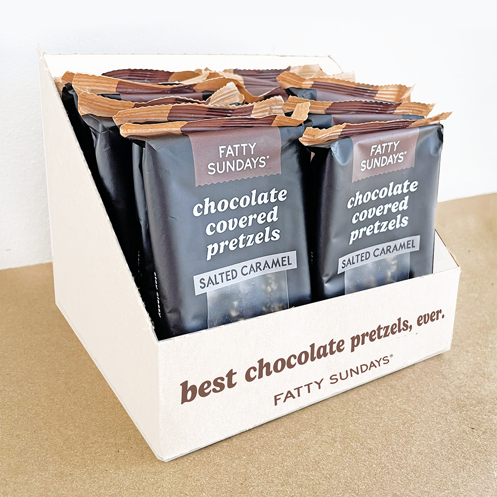 Stay classy with our most decadent flavor: Salted Caramel! Inside this sleek black pack you'll find pretzels covered in dark chocolate, topped with rich caramel bits and sprinkled with sea salt. Show up to your next dinner party or event with these gourmet treats and you'll certainly impress the host(ess). Bon appétit! Made with dark chocolate. 3 pretzel rods per pack, 12 packs per display case. Each pretzel rod is approx 4" long. Certified Kosher. Shelf life: 9 months.